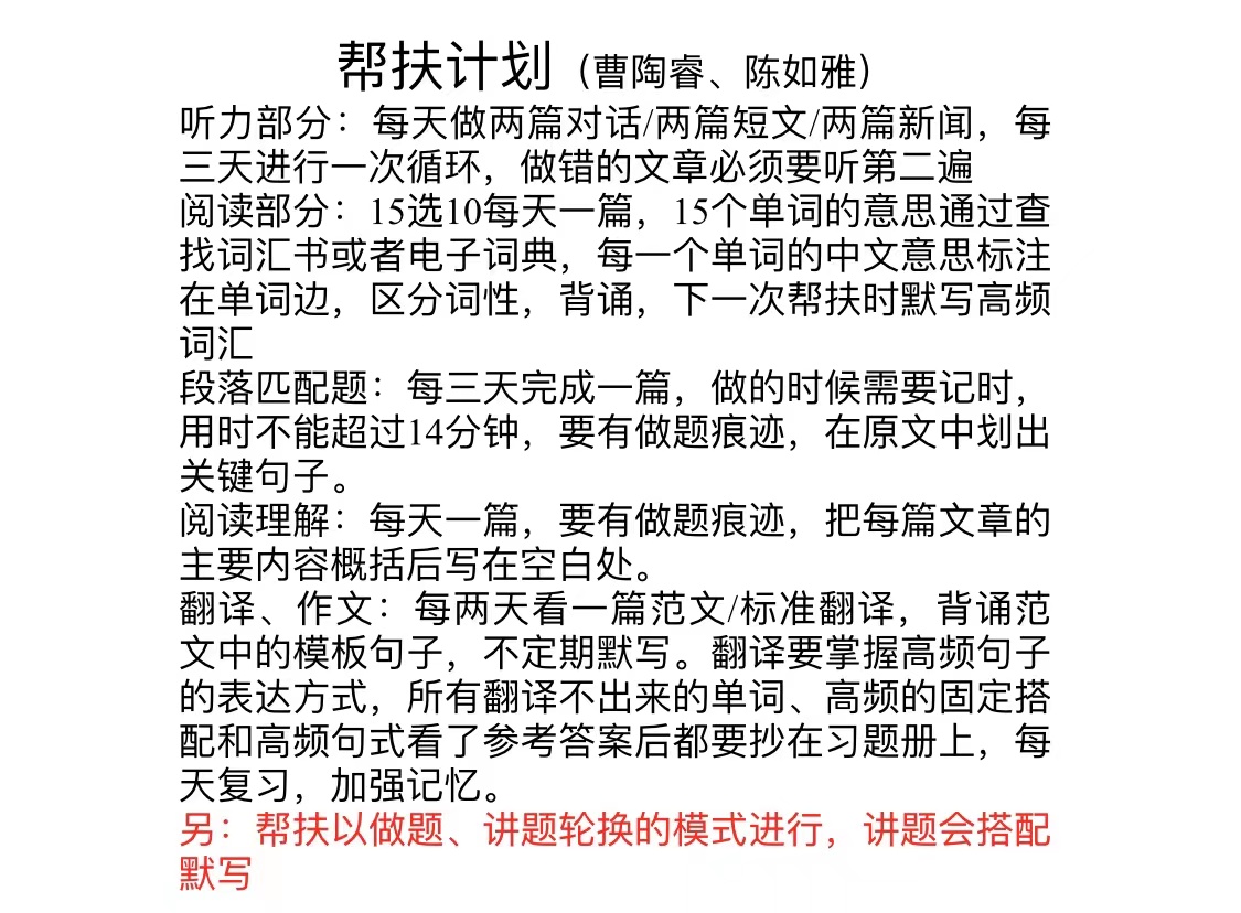 学院通过前期报名,招募并筛选英语四六级高分通过的学生及需要帮扶学生,根据专业设置及需求安排1-3人进行帮扶对接。为了把帮扶工作落到实处,英语学习帮扶一周不少于三次,每次不少于一小时的,由学习部进行签到签退、统计学习计划和每周的学习成果。